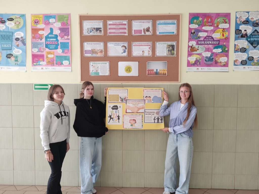 - Gazetka informacyjna: Na głównym korytarzu pojawiła się tematyczna gazetka szkolna, pełna ciekawostek, definicji i najważniejszych zasad mediacji. Była to doskonała okazja, aby w wolnej chwili poszerzyć swoją wiedzę o metodach ugodowego rozwiązywania sporów.