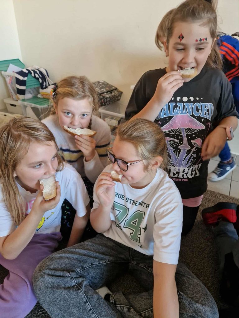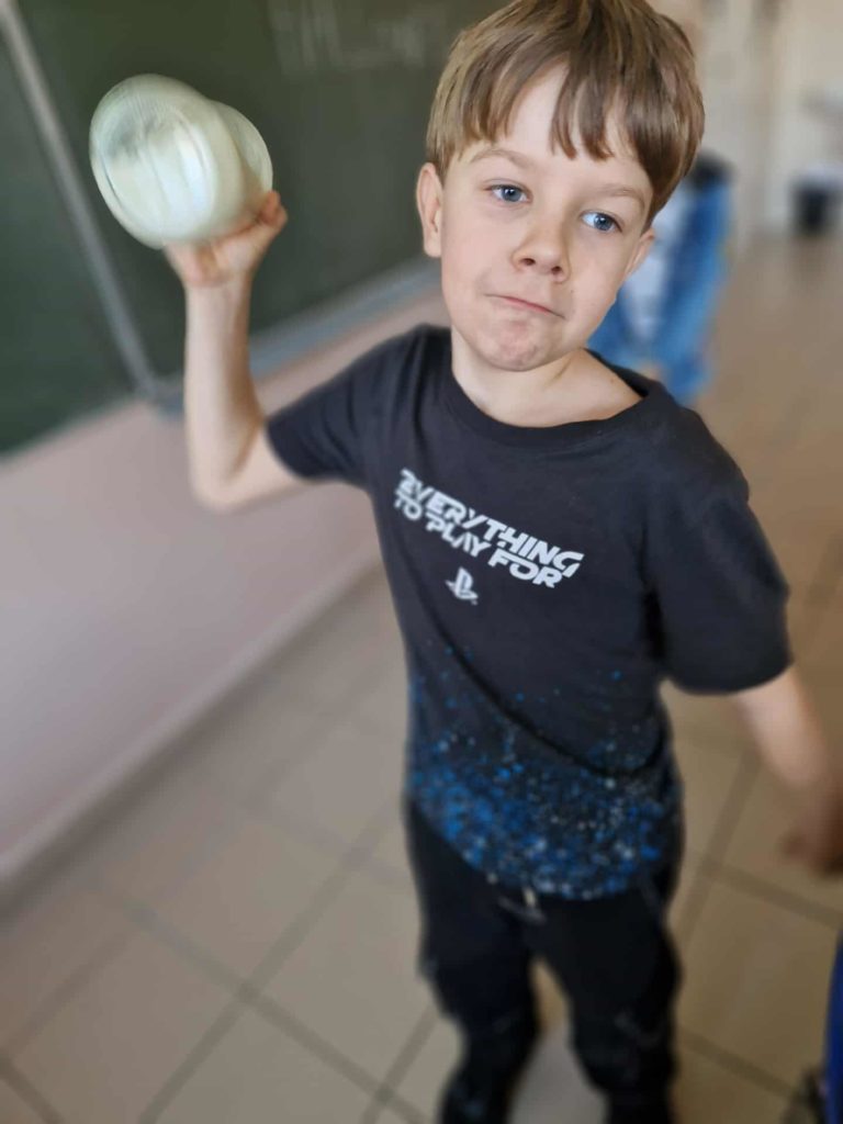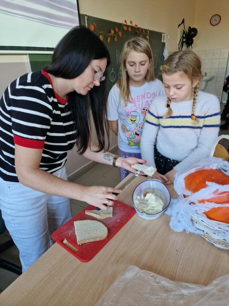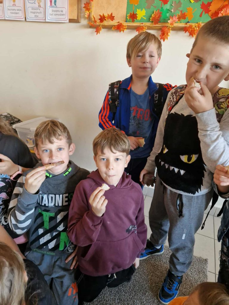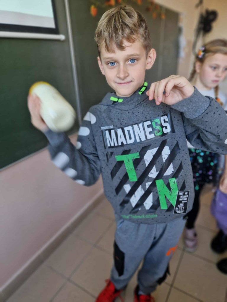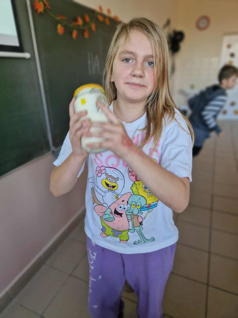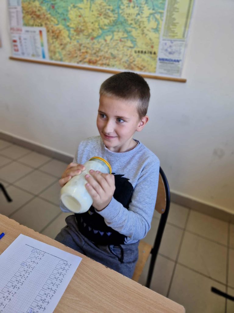Uczniowie klasy 3a przypomnieli sobie, jak należy prawidłowo się odżywiać, jakie wartości odżywcze ma mleko i produkty z niego wykonane. Zapoznali się z metodą wyrabiania masła. Po takim wstępie dzieci przystąpiły do własnoręcznego ubijania masła. Praca była ciężka, ale efekt przeszedł oczekiwania. Dużym zaskoczeniem było, gdy ze słoika ze śmietaną, po długim ubijaniu zostało wyjęte masło. Dzieci zajadały się ze smakiem.