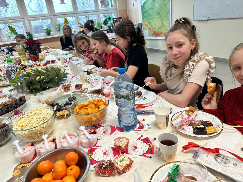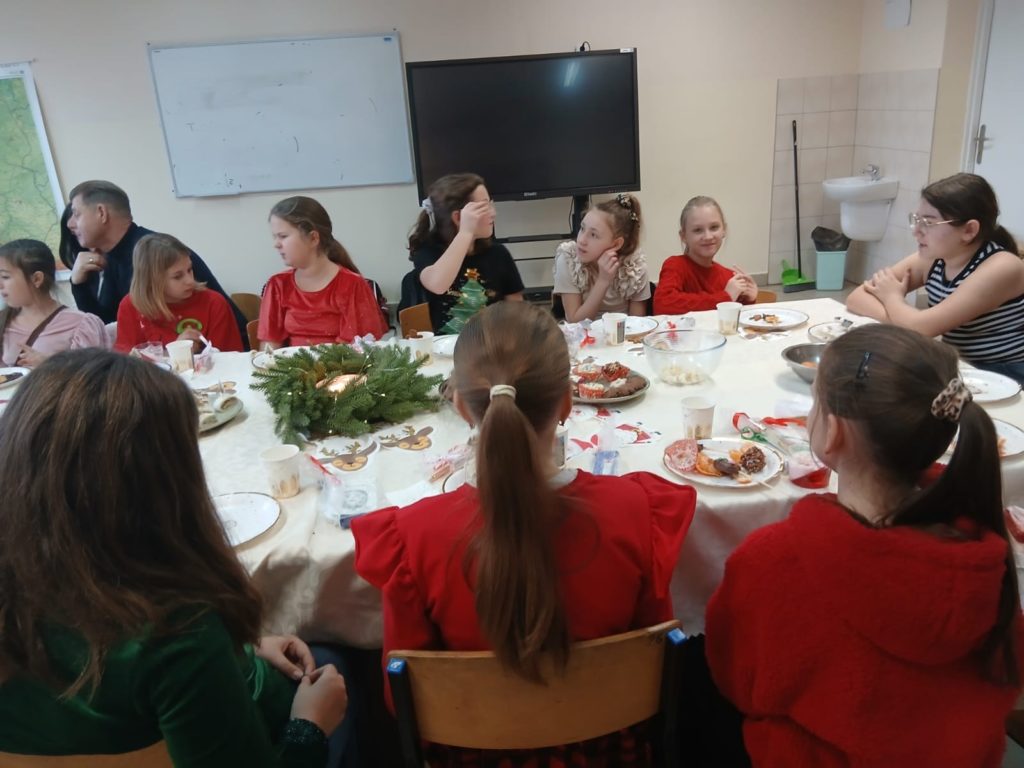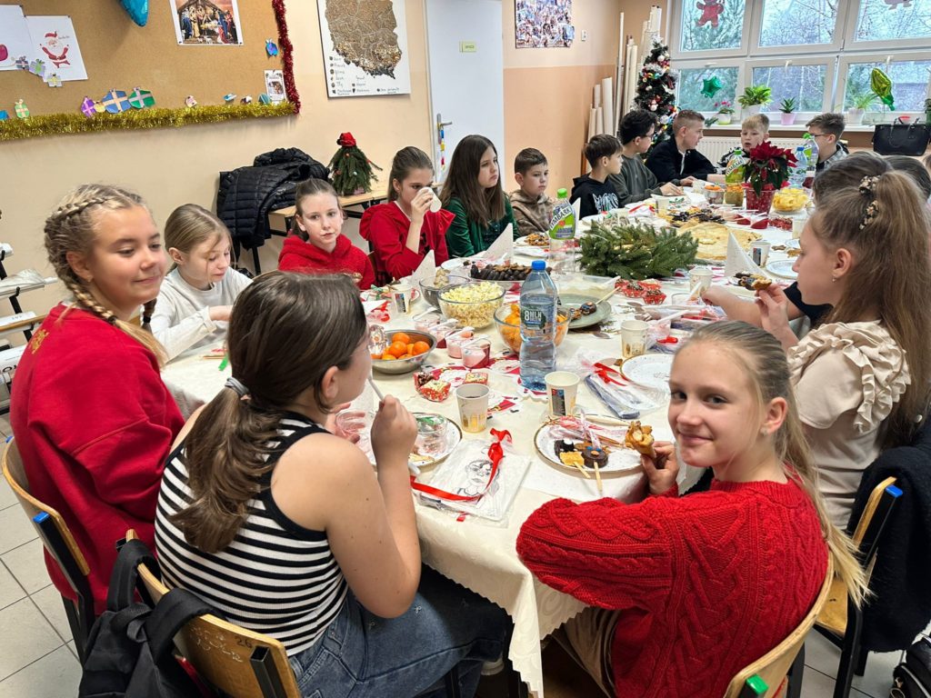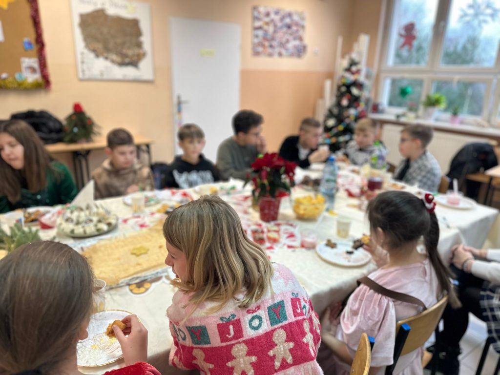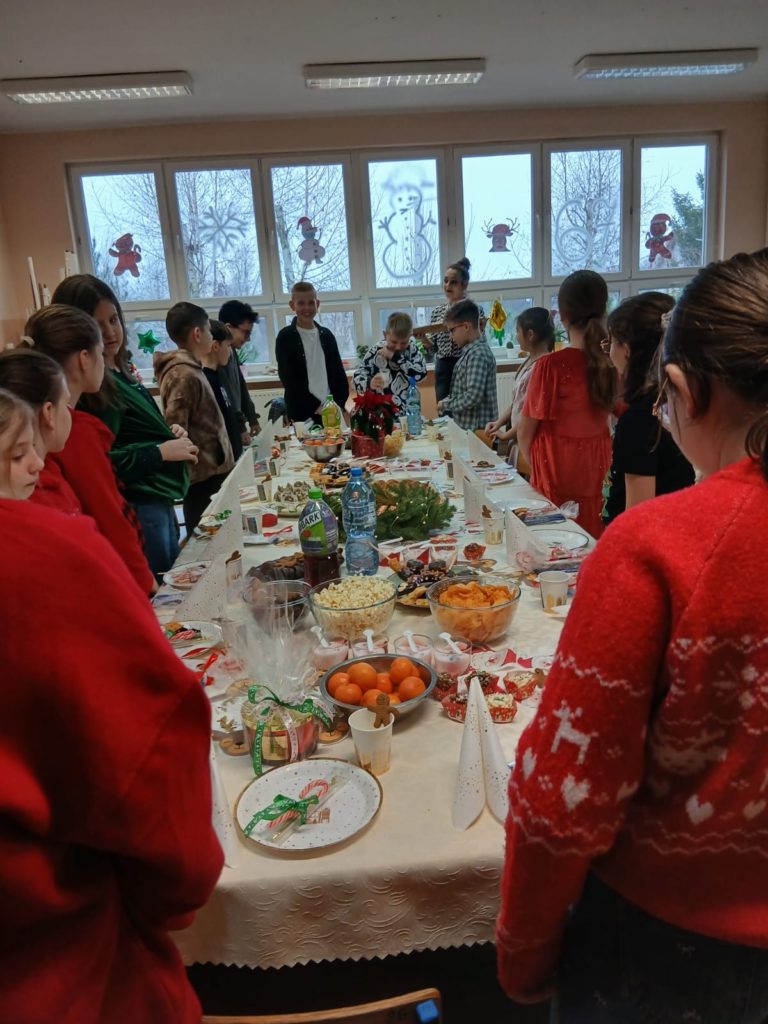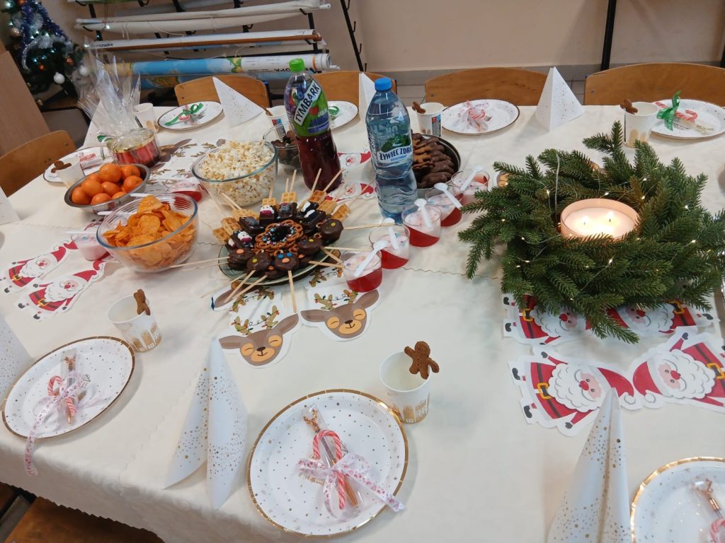 Na świątecznie udekorowanym stole nie zabrakło tradycyjnych przysmaków, opłatka oraz drobnych upominków dla każdego ucznia. Wspólne słuchanie kolęd stworzyło ciepłą, radosną atmosferę, pełną życzliwości i wzajemnej bliskości.