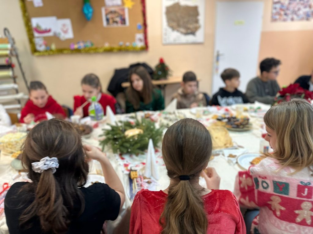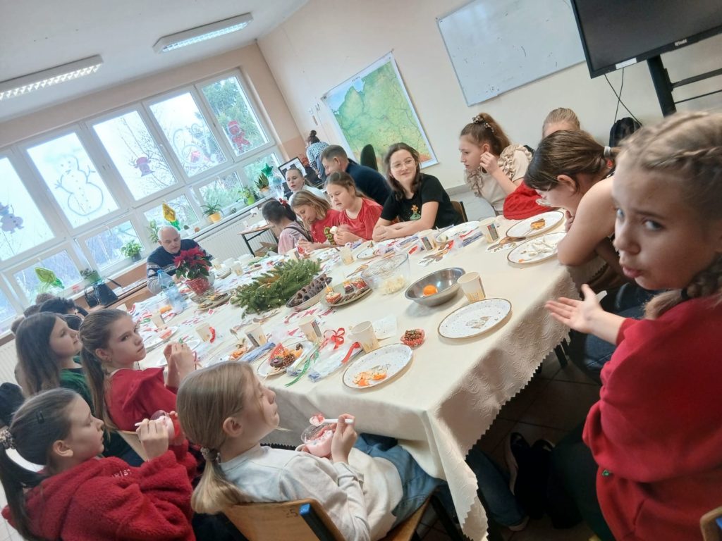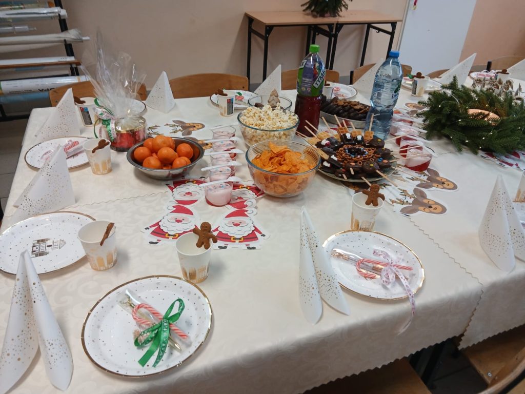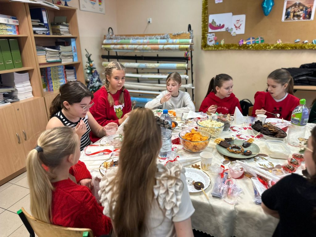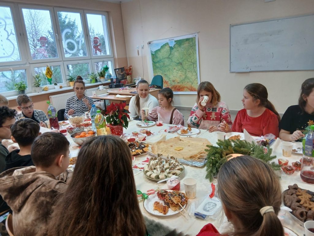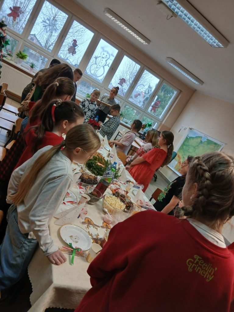 Na świątecznie udekorowanym stole nie zabrakło tradycyjnych przysmaków, opłatka oraz drobnych upominków dla każdego ucznia. Wspólne słuchanie kolęd stworzyło ciepłą, radosną atmosferę, pełną życzliwości i wzajemnej bliskości.