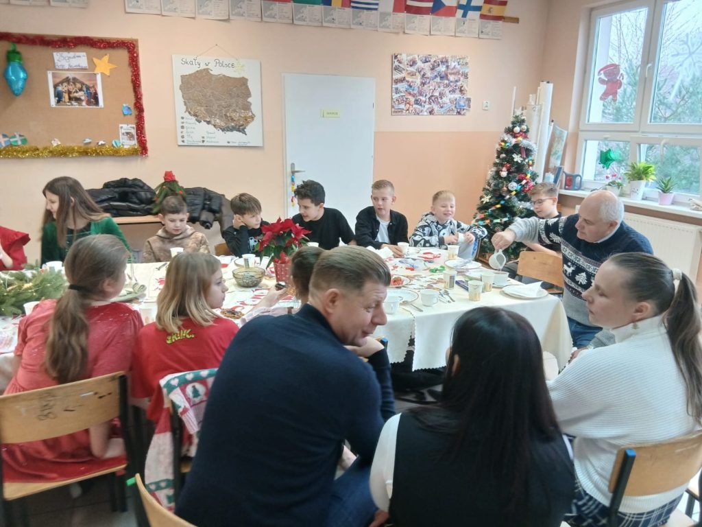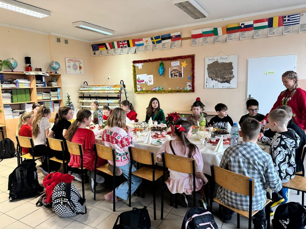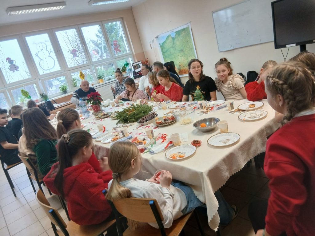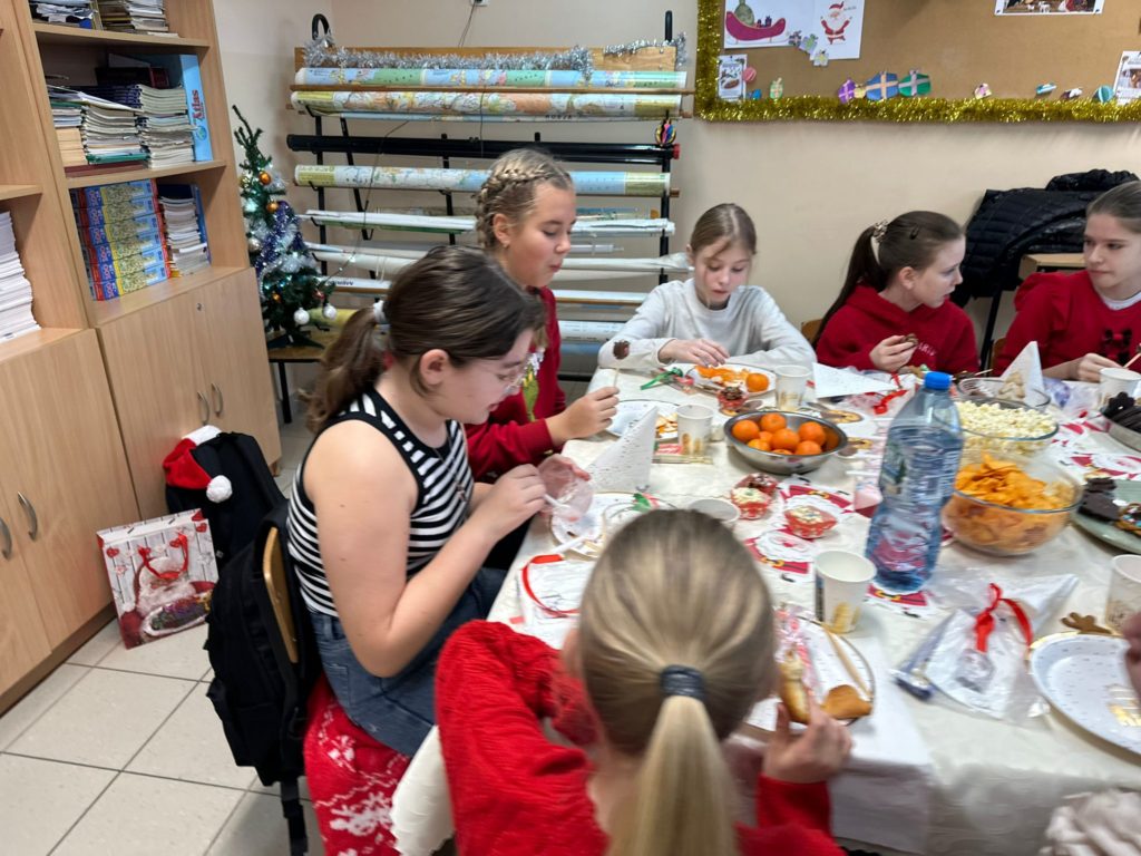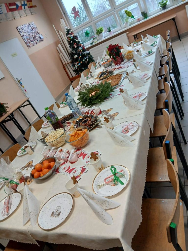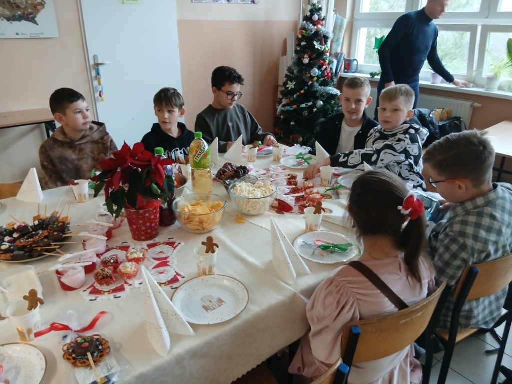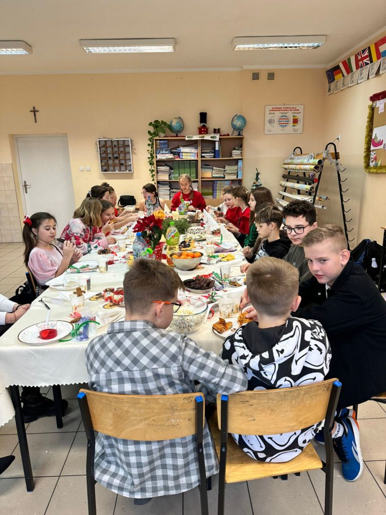 Na świątecznie udekorowanym stole nie zabrakło tradycyjnych przysmaków, opłatka oraz drobnych upominków dla każdego ucznia. Wspólne słuchanie kolęd stworzyło ciepłą, radosną atmosferę, pełną życzliwości i wzajemnej bliskości.