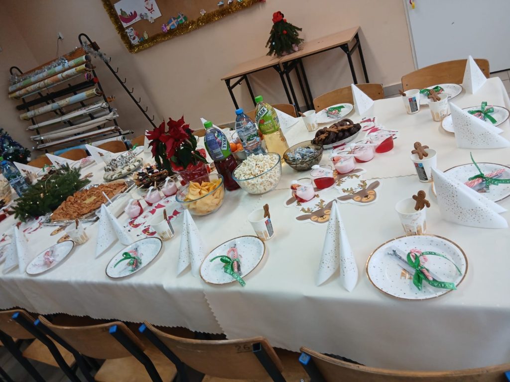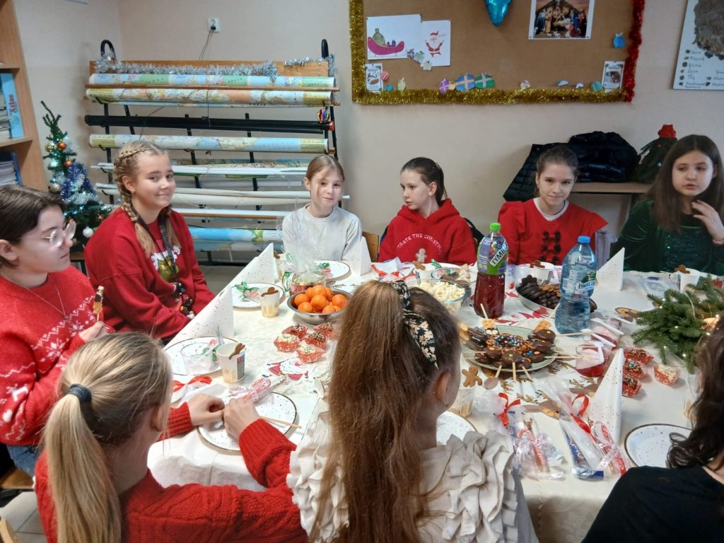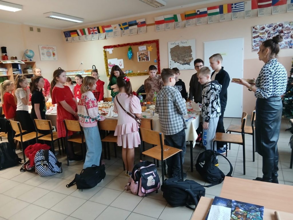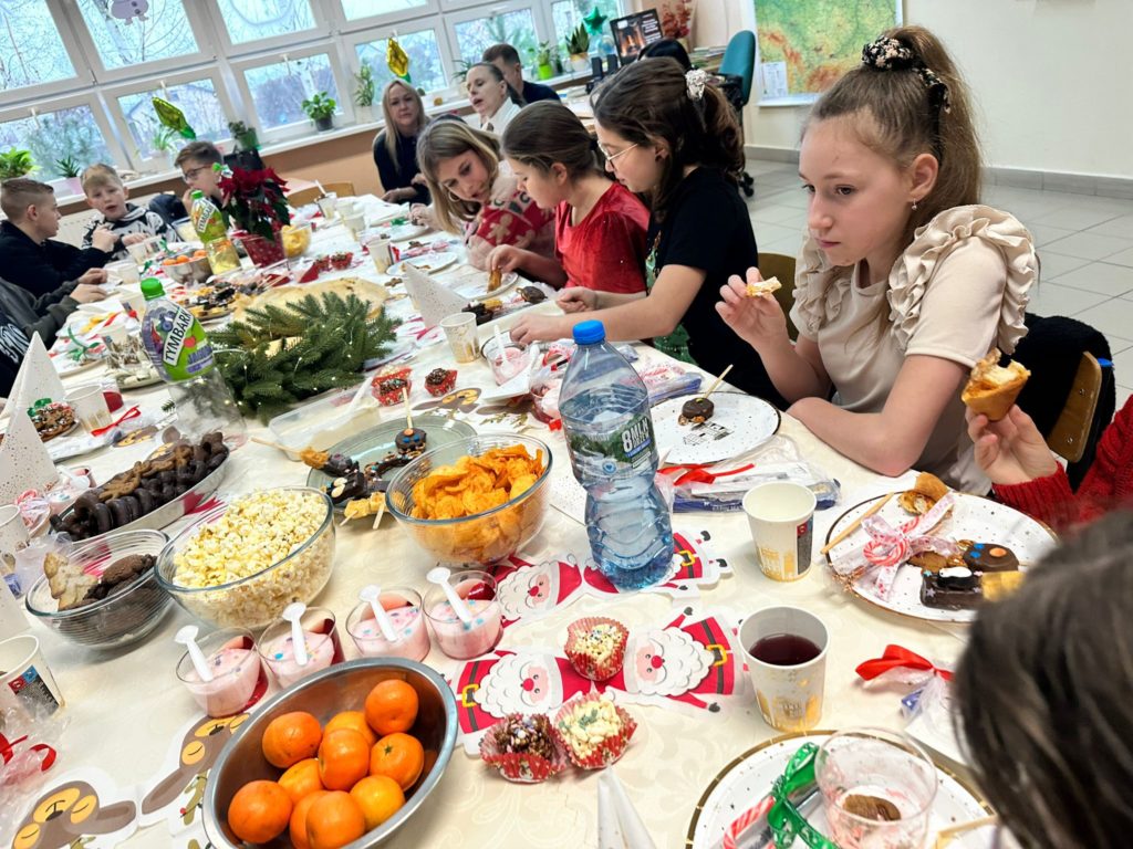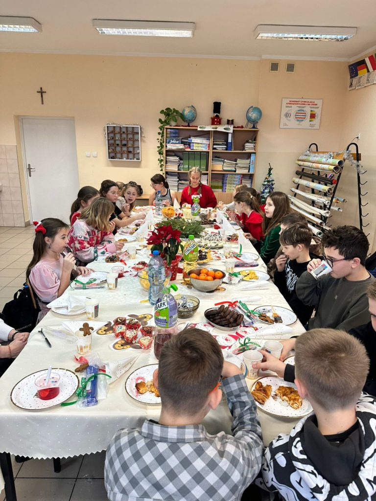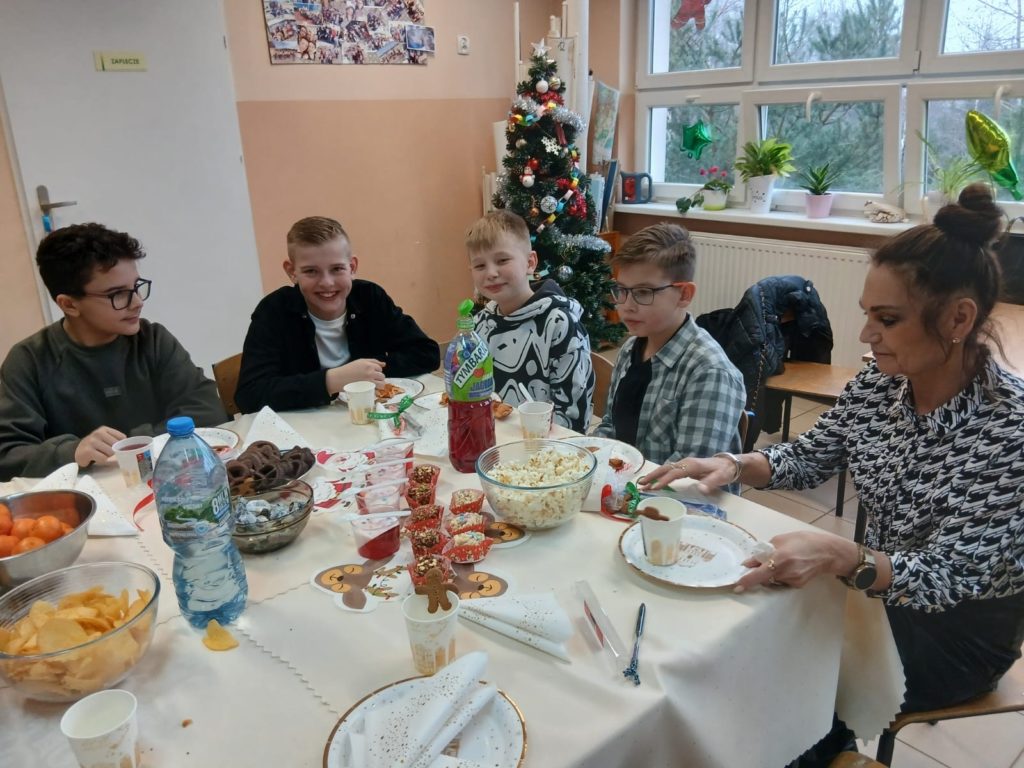 Na świątecznie udekorowanym stole nie zabrakło tradycyjnych przysmaków, opłatka oraz drobnych upominków dla każdego ucznia. Wspólne słuchanie kolęd stworzyło ciepłą, radosną atmosferę, pełną życzliwości i wzajemnej bliskości.