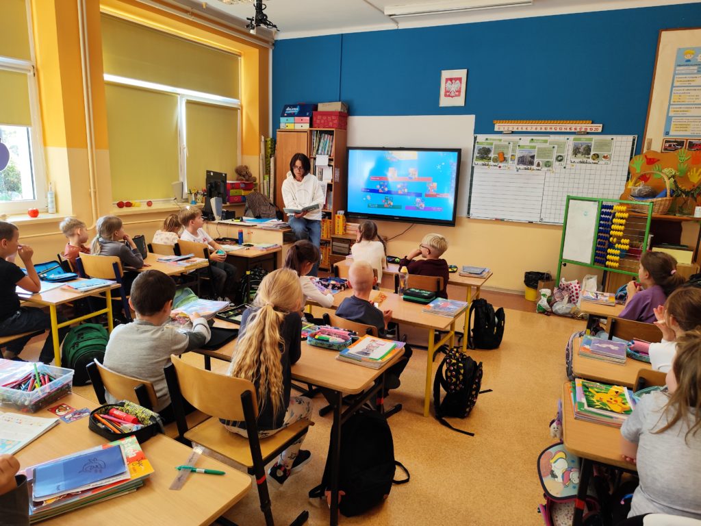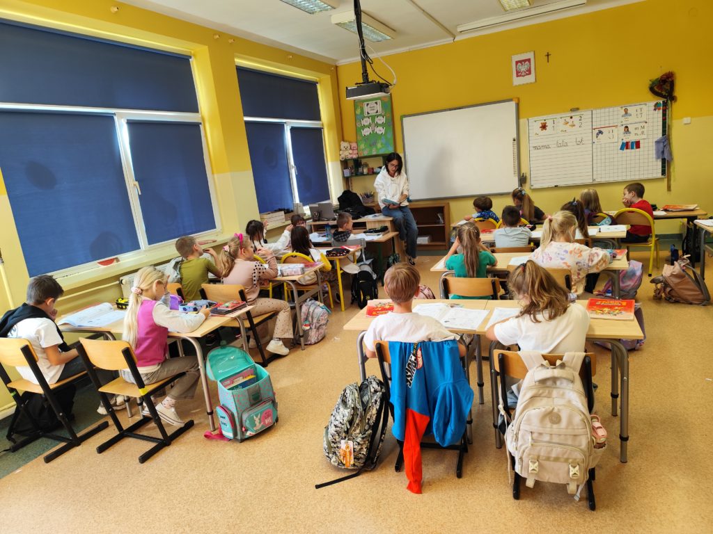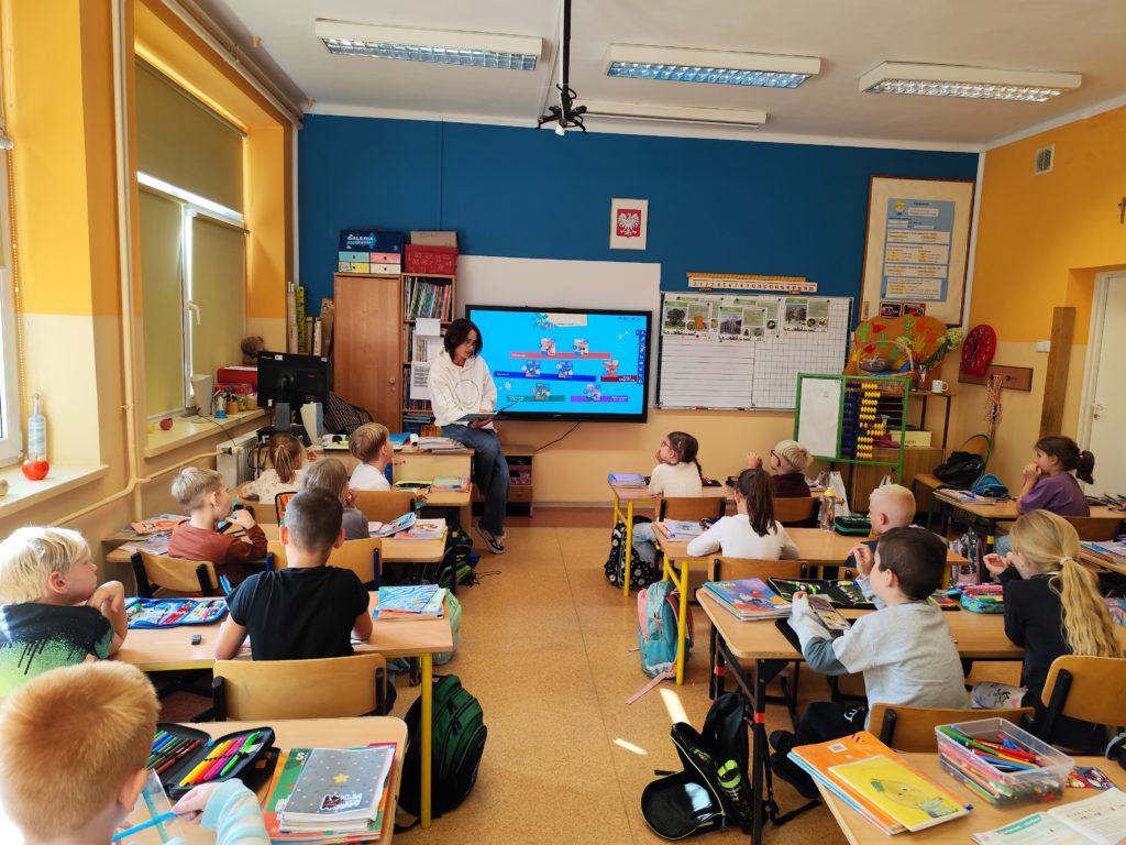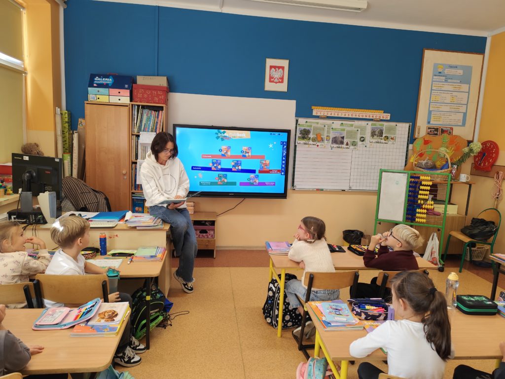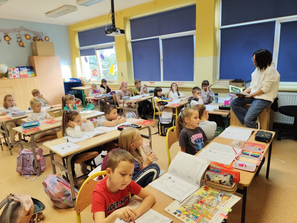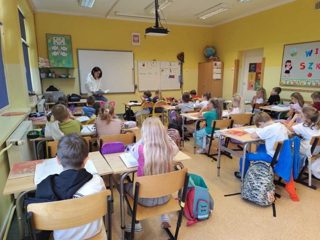 Dziś nauczyciel bibliotekarz odwiedził klasę 1a i 1b, porozmawiał na temat zalet czytania książek i przeczytał fragment książki pod tytułem „Drzewo do samego nieba” autorstwa Marii Terlikowskiej.