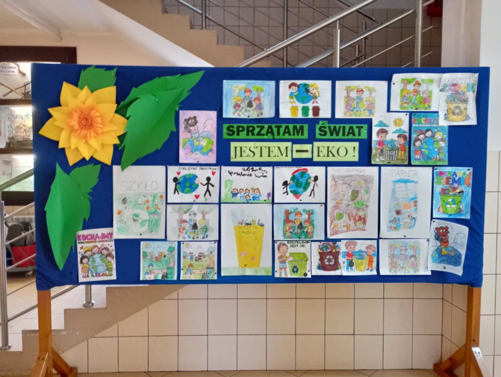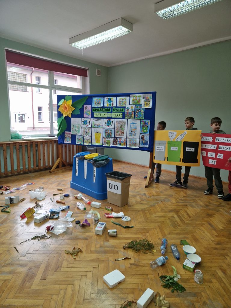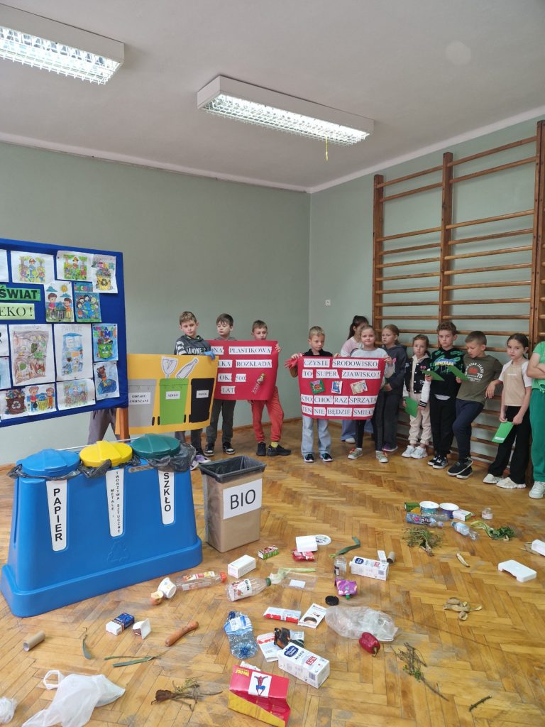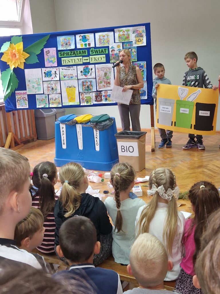 Na sali gimnastycznej odbyła się prelekcja na temat segregacji odpadów i roli ochrony przyrody dla naszego zdrowia i przyszłości naszej planety w wykonaniu uczniów z klas 1-3. Następnie wszystkie dzieci udały się na teren szkoły aby pozbierać śmieci.