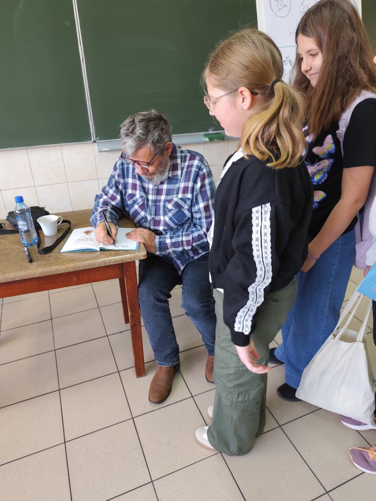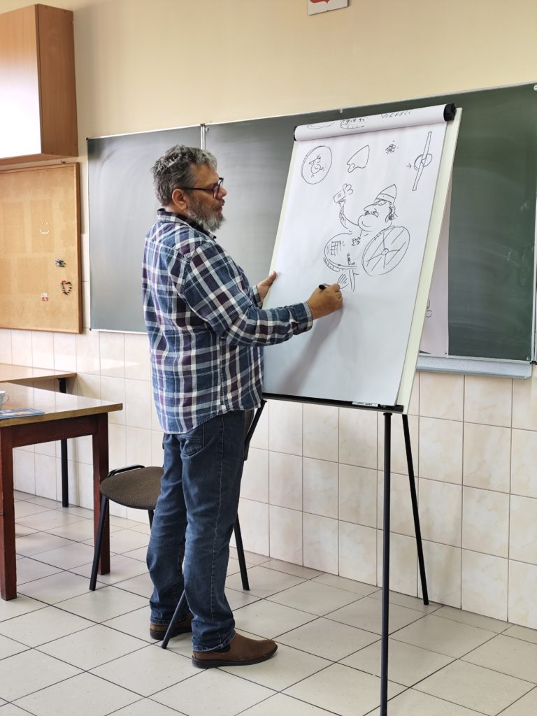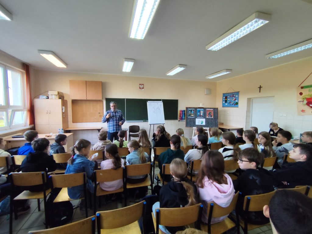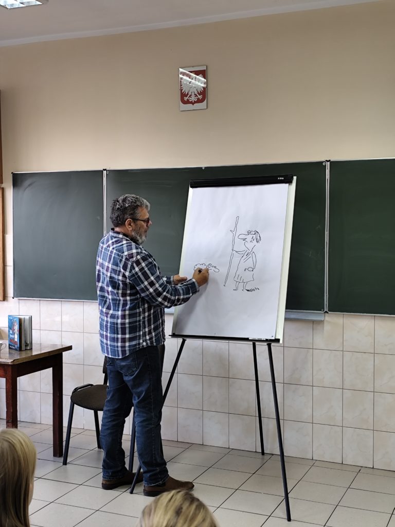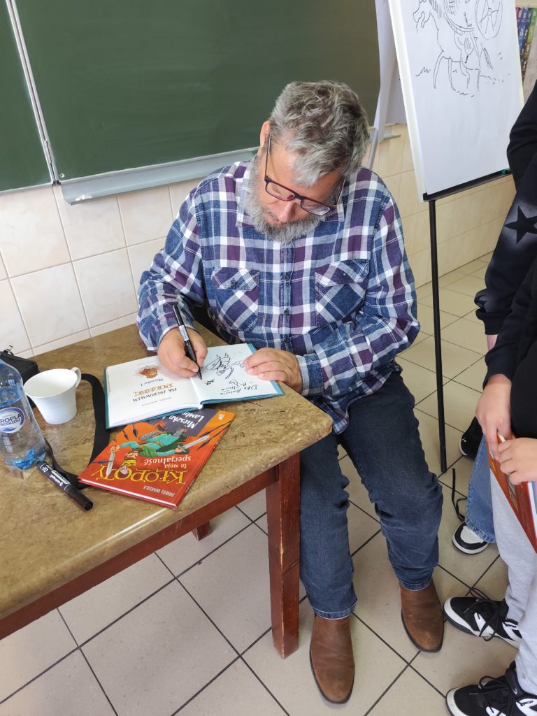 Dużą atrakcją była część poświęcona rysunkowi, podczas której autor na żywo demonstrował, jak tworzy ilustracje, zachęcając jednocześnie uczniów do rozwijania własnych talentów plastycznych.
