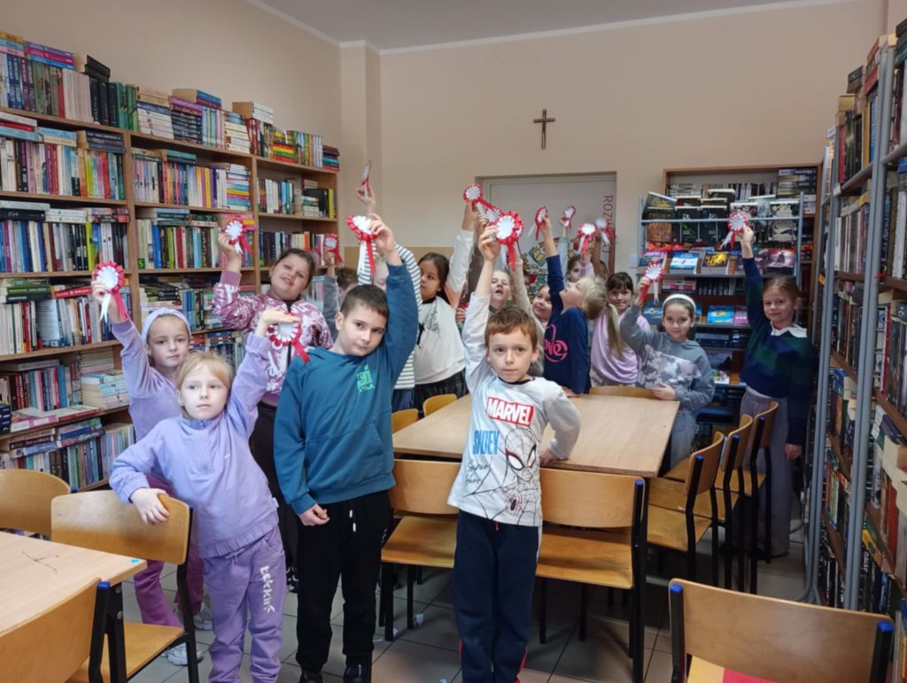 Dnia 5 i 6 listopada 2025r. uczniowie z klasy 2a i 2b byli na warsztatach w Bibliotece Publicznej Gminy Turek w naszej szkole. Były to warsztaty związane ze świętem Niepodległości. Dzieci wysłuchały wiersza „Kto Ty jesteś” i wypowiadały się na jego temat. Dowiedziały się jakie są symbole Polski i co oznaczają. Następnie z pomocą Pani bibliotekarki i wychowawców wykonały kotyliony.
