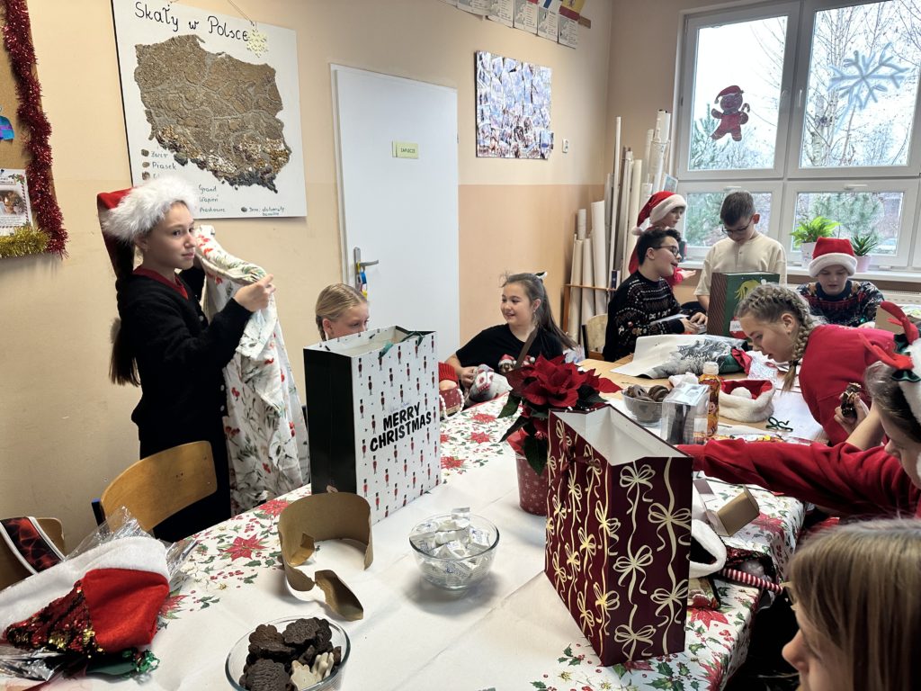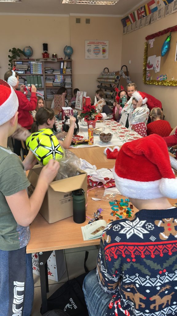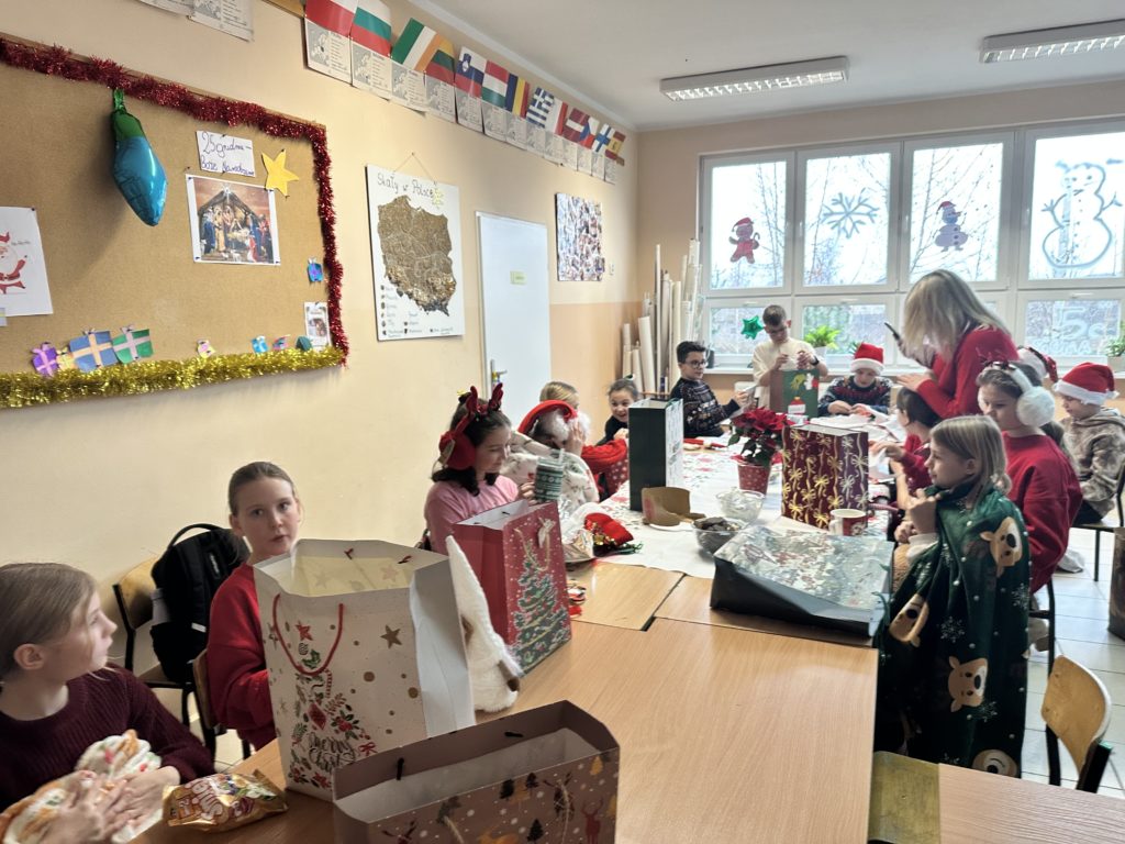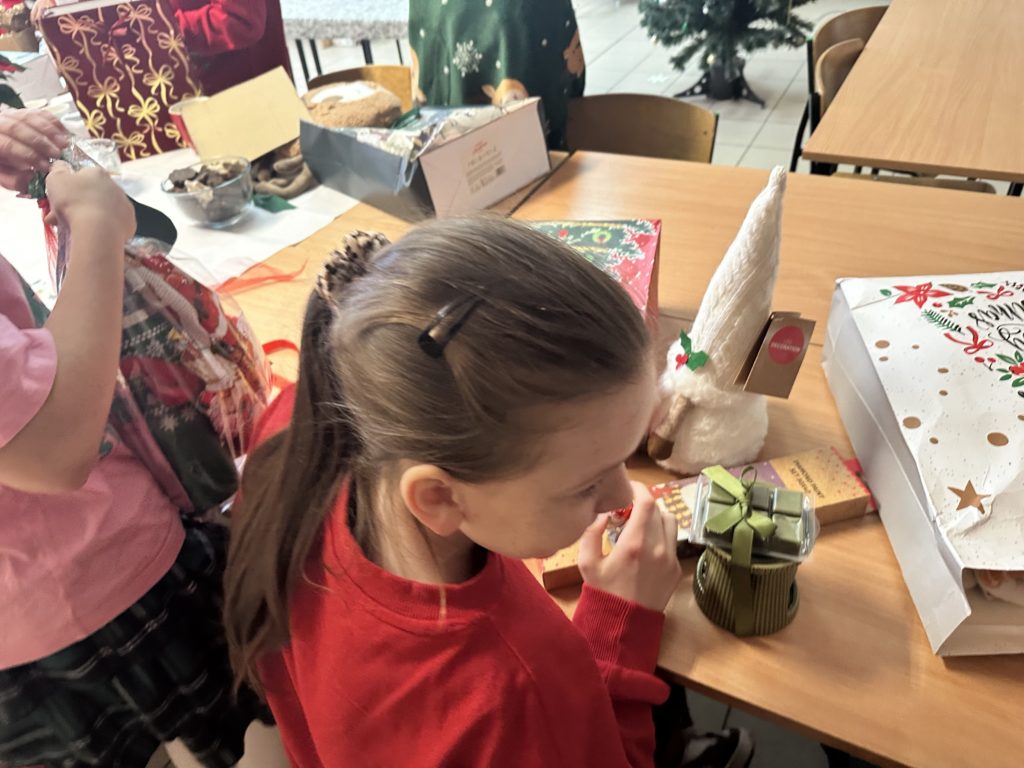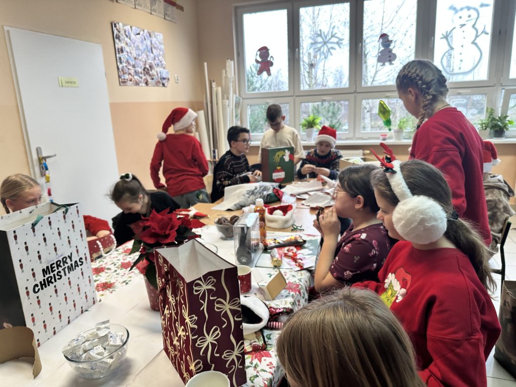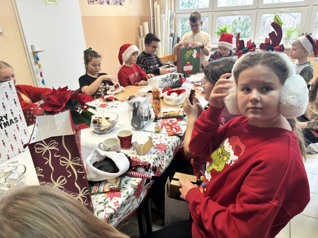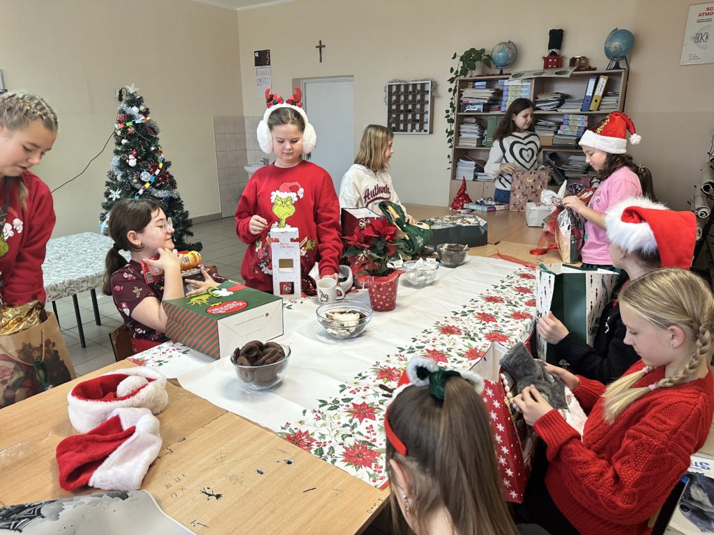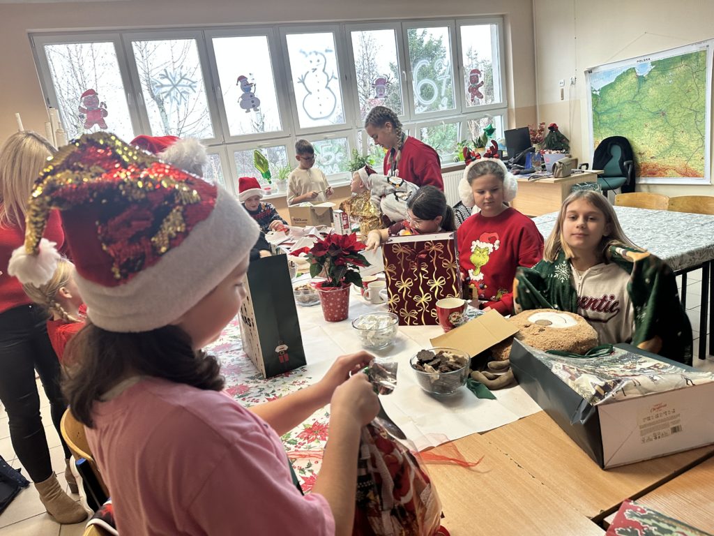 Dzień upłynął w atmosferze radości i niespodzianek — każdy uczeń przygotował paczkę mikołajkową dla wylosowanej osoby. Nie zabrakło świątecznej muzyki, słodkiego poczęstunku i wielu uśmiechów. To był wyjątkowy dzień pełen ciepła i dobrej zabawy, który wprowadził wszystkich w świąteczny nastrój.