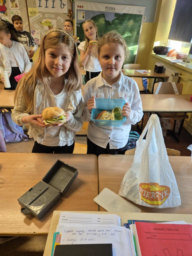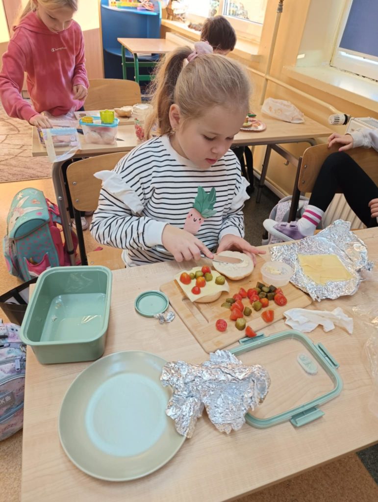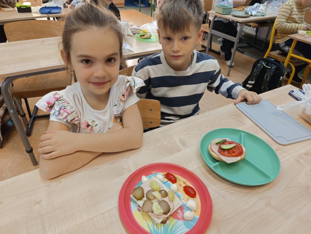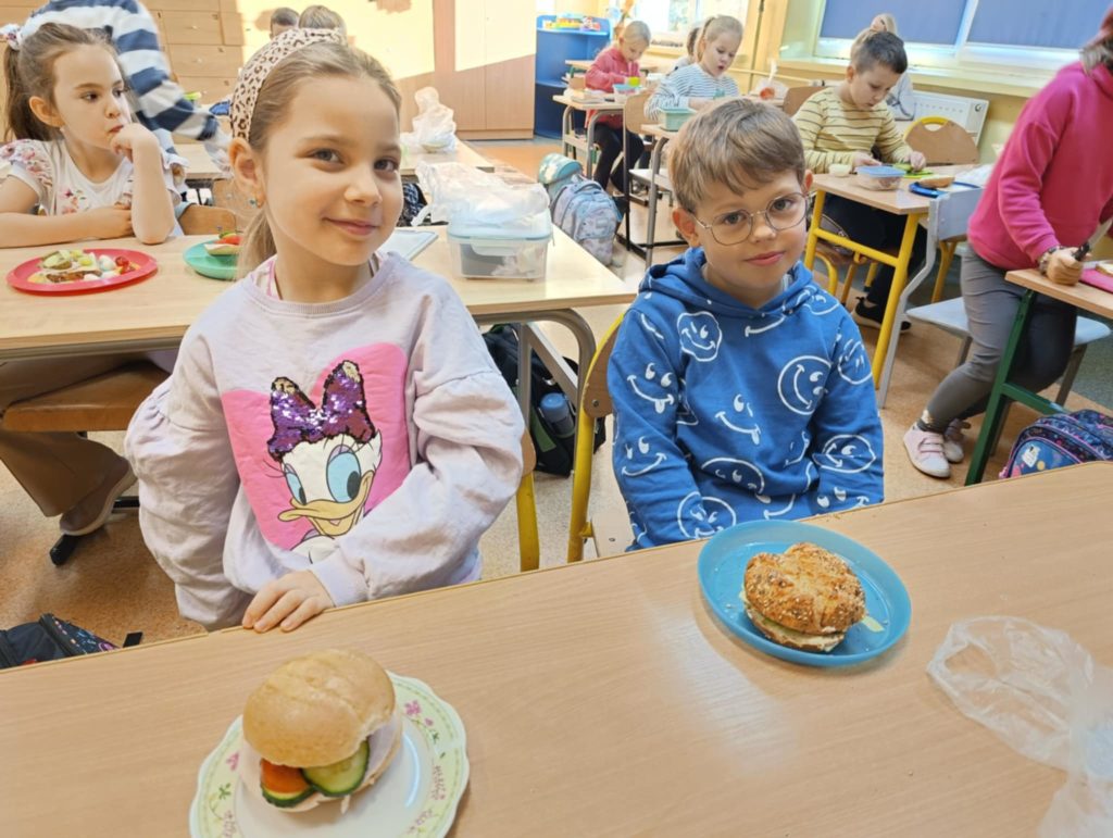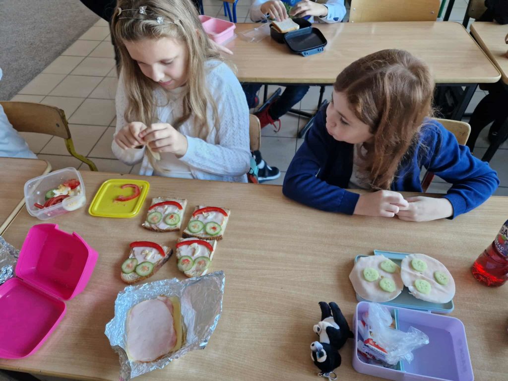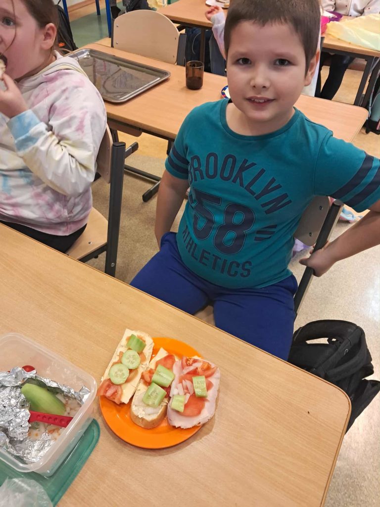 Dnia 7 listopada wszyscy uczniowie z klas 1-3 przygotowywali zdrowe śniadanie w postaci kanapek. Dzieci tworzyły również z kanapek wesołe zwierzaki. Działania te miały zwrócić dzieciom uwagę na to, że pierwszy posiłek w ciągu dnia powinien być bogaty w warzywa, które dostarczają Nam wielu witamin niezbędnych dla zdrowia.