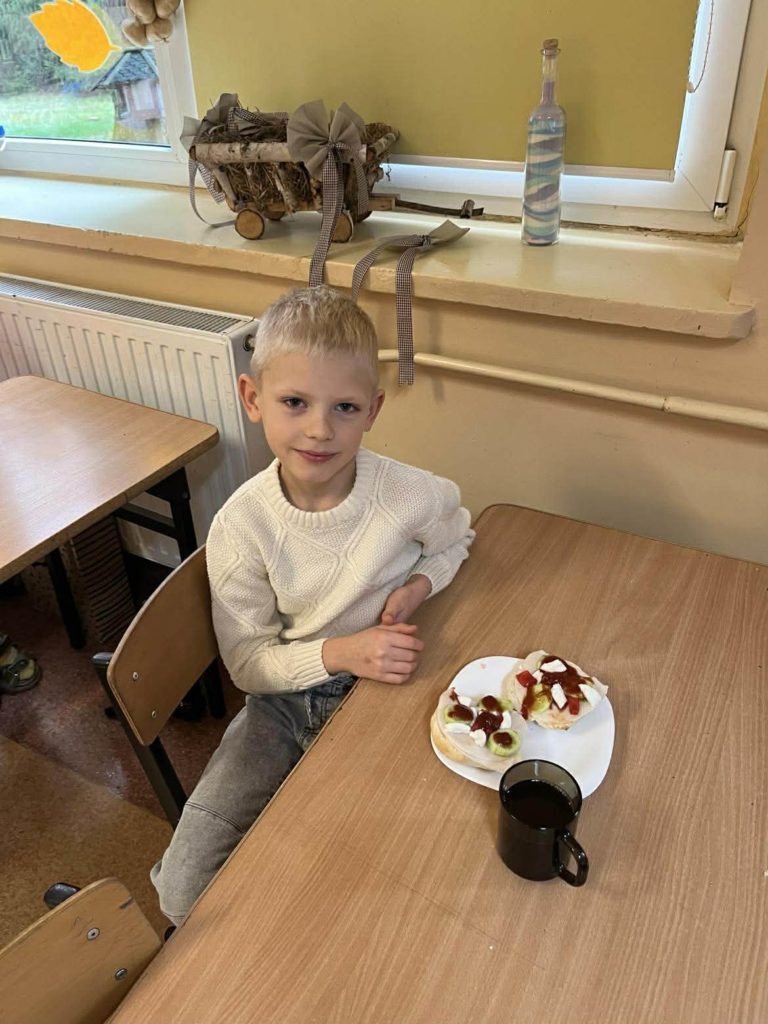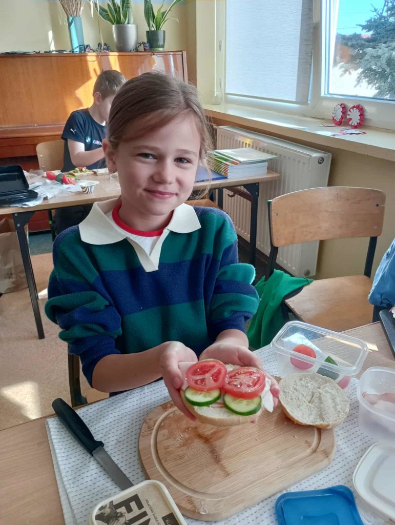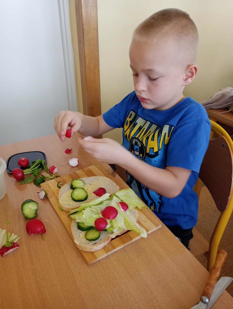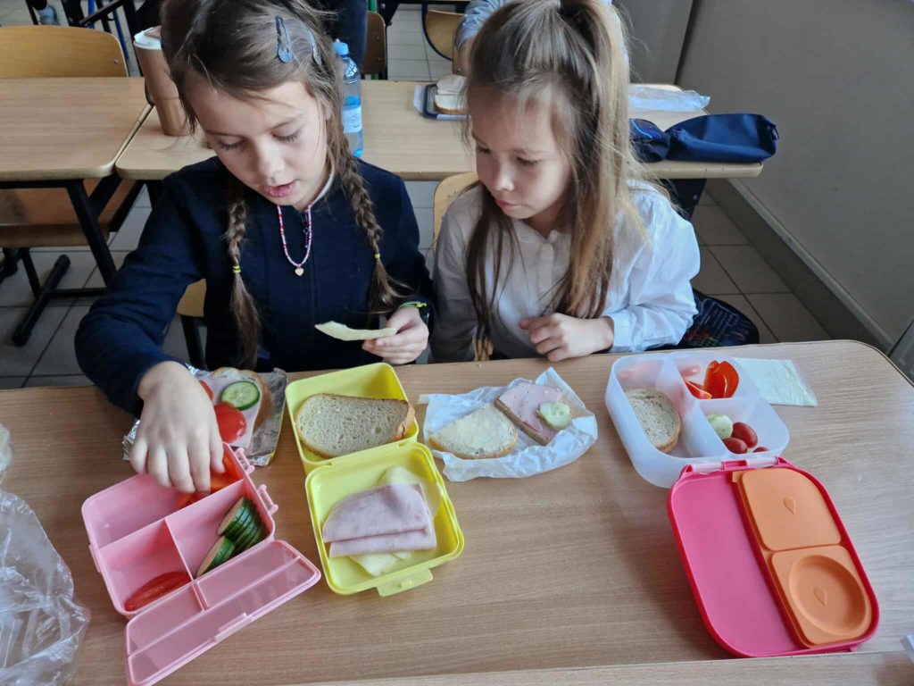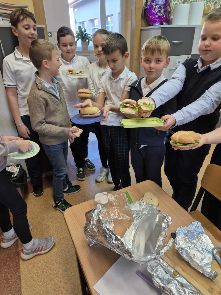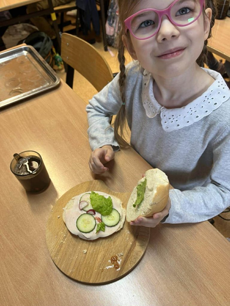 Dnia 7 listopada wszyscy uczniowie z klas 1-3 przygotowywali zdrowe śniadanie w postaci kanapek. Dzieci tworzyły również z kanapek wesołe zwierzaki. Działania te miały zwrócić dzieciom uwagę na to, że pierwszy posiłek w ciągu dnia powinien być bogaty w warzywa, które dostarczają Nam wielu witamin niezbędnych dla zdrowia.